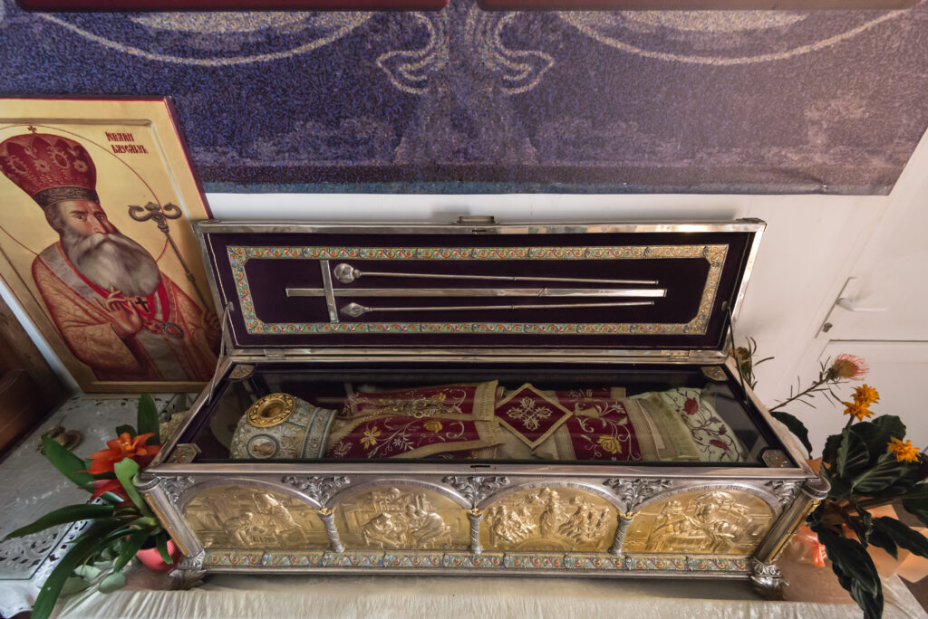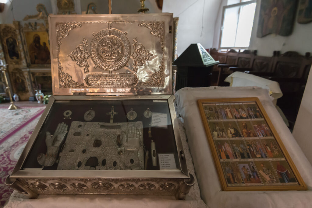 Pe lângă acestea, o bucăţică din lemnul Sfintei Cruci este încadrată în metal.