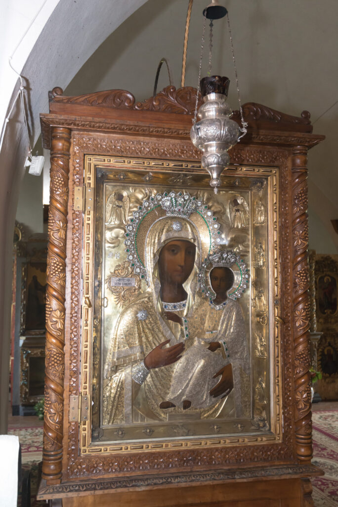 În interiorul bisericii se află icoana Maicii Domnului, Făcătoarea de Minuni, de o mare expresivitate artistică, precum şi moaştele Sfântului Ierarh Grigorie Dascălul, Mitropolitul Ţării Româneşti aşezate la loc de cinste într-o raclă de argint aurit cu medalioane ce conţin scene din viaţa sfântului, şi el ostenitor în obştea mănăstirii.